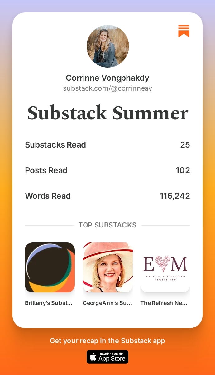 You can see your own summer recap in the Substack app. I’d love to see what you’ve been reading.